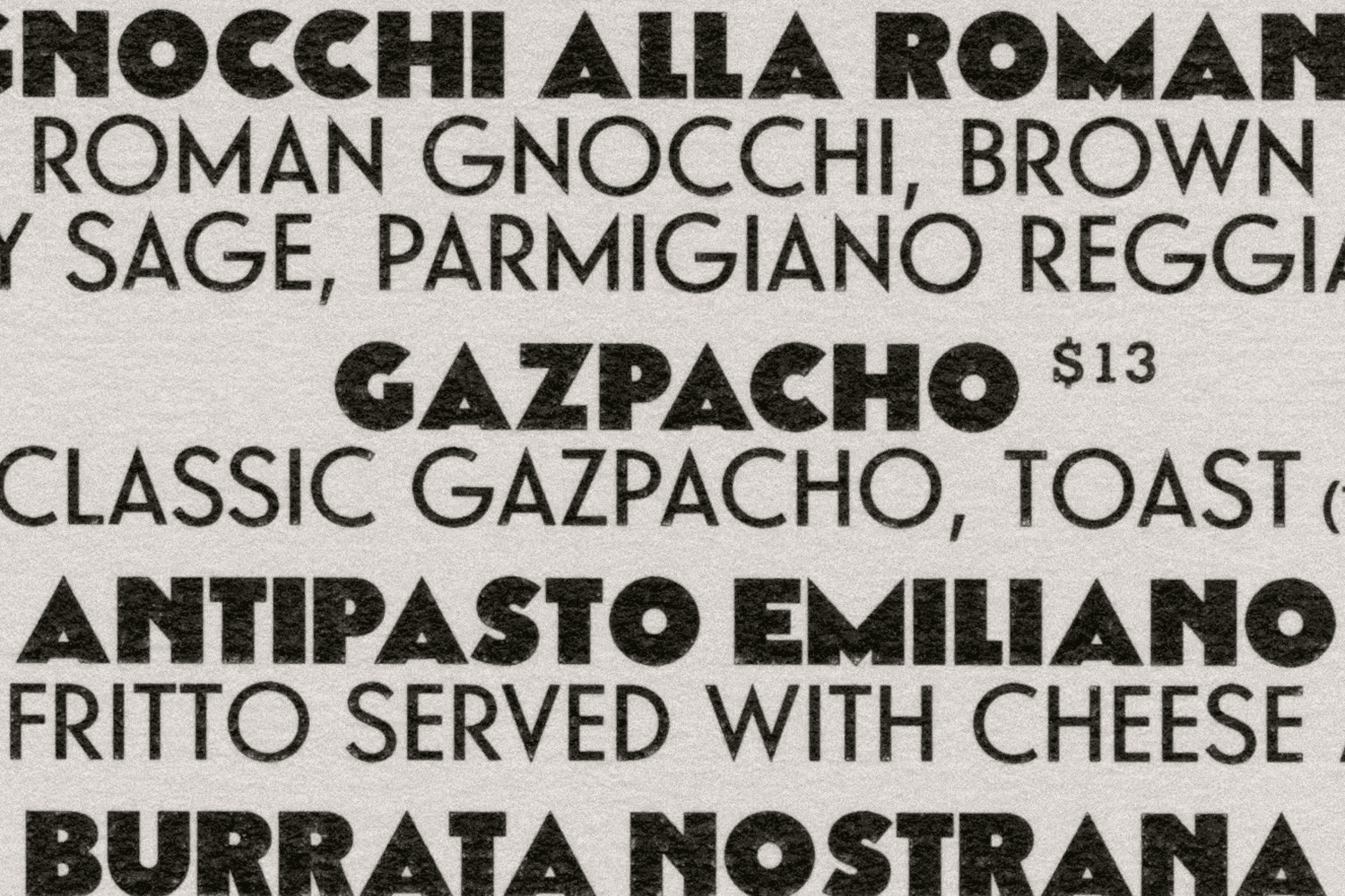 맞춤형 글꼴인 Grand Bacàn Sans는 1900년대 초반 이탈리아의 시각 언어에 스며든 목재와 금속 글꼴에서 영감을 받았으며, 순수한 기하학과 무거운 무게감이 결합되어 강렬하면서도 친근한 시각적 톤을 구현합니다.