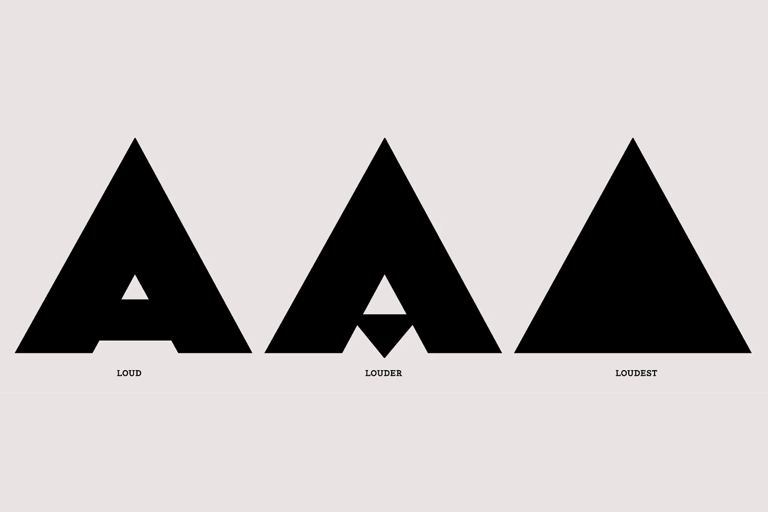 타이포그래피를 살펴보면 브랜드를 위해 맞춤으로 제작한 폰트이지 않을까 싶습니다. 변화되는 정도에 따라 LOUD / LOUDER / LOUDEST 로 적혀있는데, 정확한 의도는 알기 어렵습니다. 변화 정도가 점점 강해질(?)수록 조금 더 도형에 가까운 형태로 변화하고 있습니다. 변형의 정도가 다른 3종류의 글꼴이 하나의 패밀리를 이루고 있습니다.