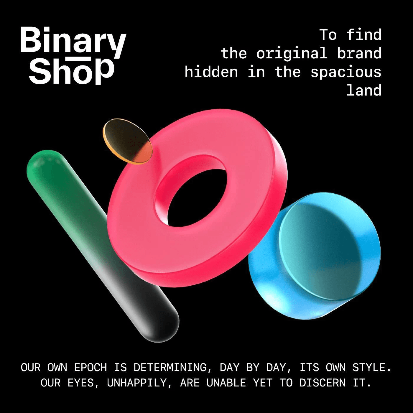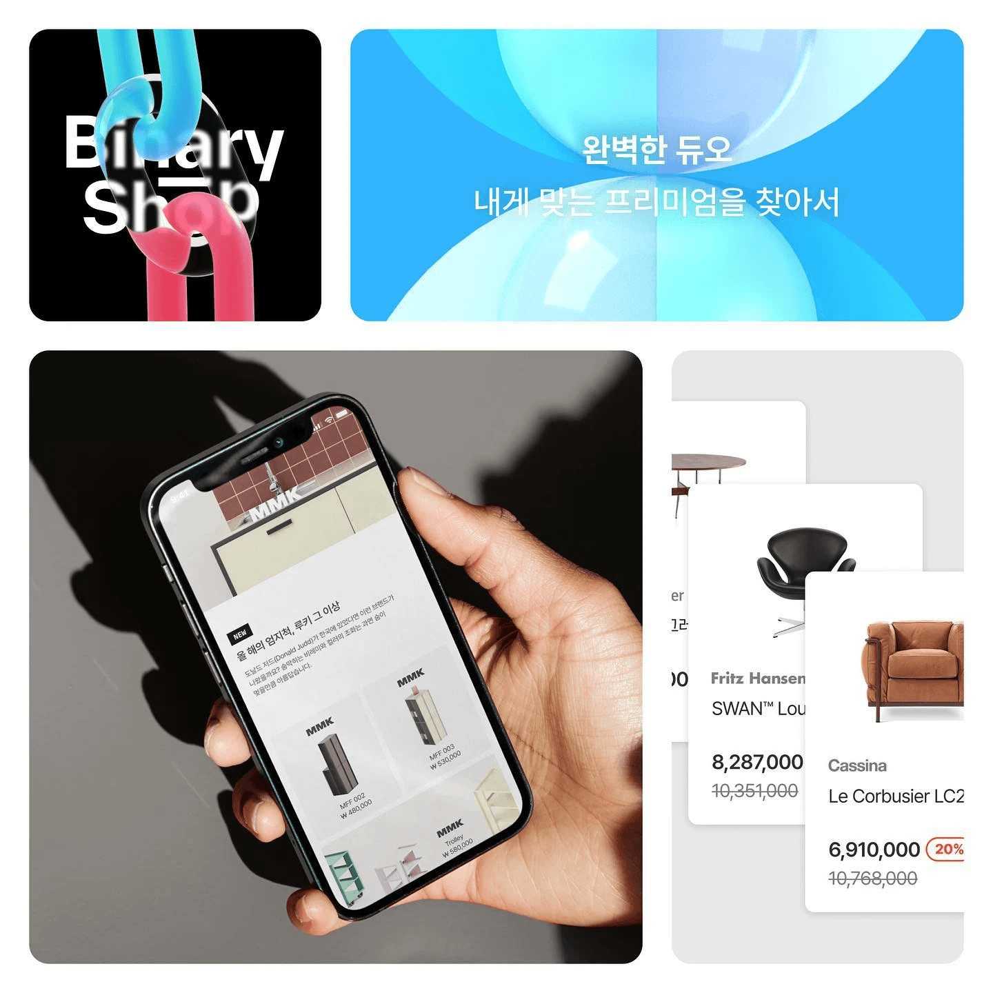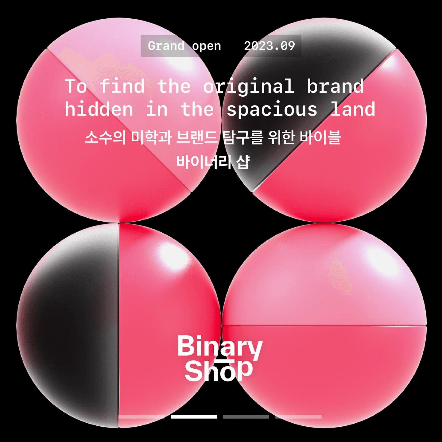 라틴 알파벳 폰트를 왜 고정폭 폰트로 사용했는 지 알 수 있었어요. 이진법을 뜻하는 서비스 명인 <바이너리(Binary)>에서부터 시작했던 것이네요. 0과 1을 의미로 만들고 서비스의 방향과 가치를 만들어 나가는 것이 인상 깊었습니다. 0과 1사이에 있는 수 많은 개성과 브랜드들을 표현하기 위해 다양한 형태의 3D 그래픽과 색상으로 나타내지 않았을까 생각해요.