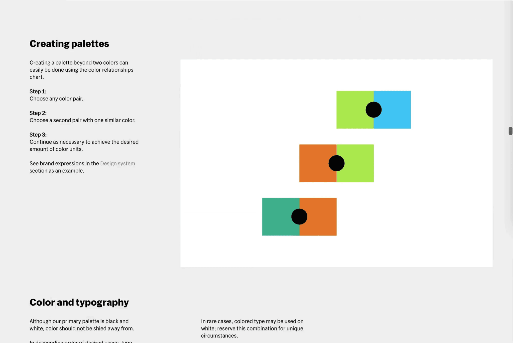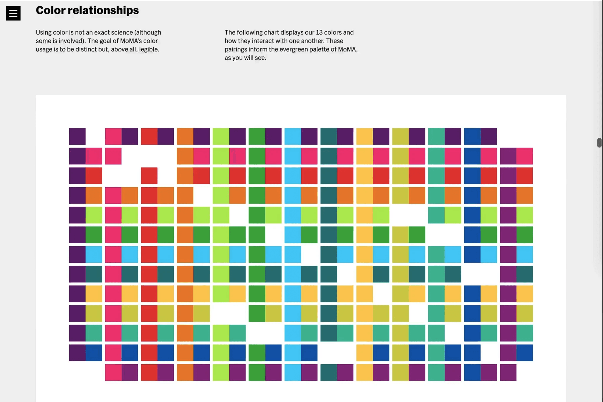 다음으로 재밌는 가이드는 Color relationships 인데요. MoMA 브랜드는 서브 컬러로 다양한 조합의 컬러들을 사용하고 있기 때문에, 두 색을 붙여 사용할 때의 색상들에 대한 가이드도 명확하게 제시하고 있습니다.
