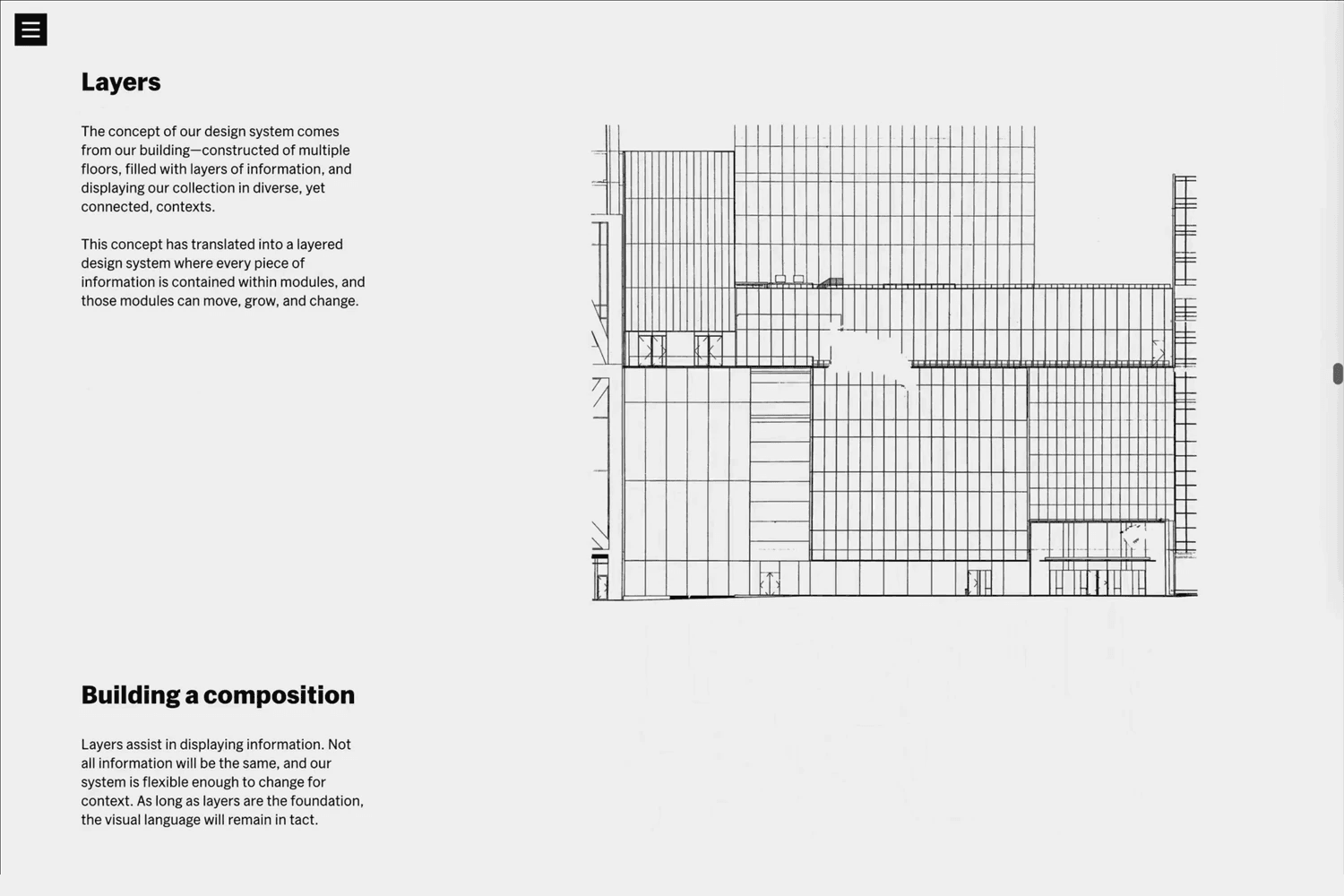 영상을 통해 MoMA 브랜드의 주요 모티프인 그리드 시스템을 확인할 수 있습니다. 모듈 한 개의 구조는 Exhibition / CTA / Art / Museum 으로 구성됩니다. 이렇게 구성된 하나의 세트들이 모듈 방식으로 계속해서 이어 붙여집니다. 여기서 더 재밌는 점은 구조를 한 단계 더 높인 단계의 시스템도 존재합니다.
