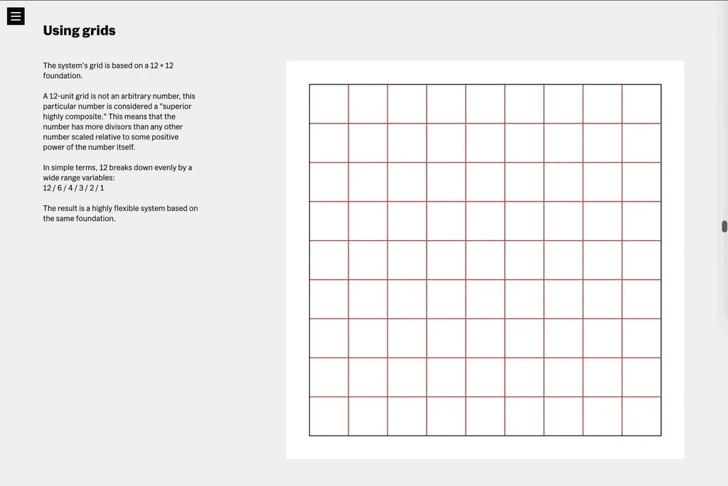 MoMA의 그리드 시스템은 기본적으로 12x12 그리드를 사용하고 있습니다. 때에 따라 12 / 6 / 4 / 3 / 2 / 1 로 나누어져 사용할 수 있습니다. 인상적인 부분은 가이드만 제시하는 것이 아니라, 그리드를 사용해서 어플리케이션을 제작하는 방법을 단계별로 나누어 자세하게 소개하고 있습니다. 이러한 부분은 브랜드에 대한 유지나 관리에 있어서도 참고하기 좋은 가이드일 것 같습니다.