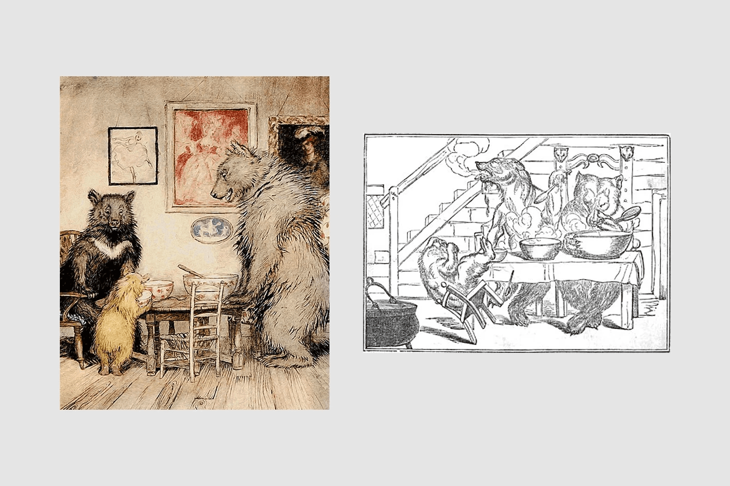 웨 토트의 곰은 궁금하여 검색해 본 동화(골디락스) 속 곰의 모습과는 전혀 다르게 표현되었습니다. 단지 동화 속 '가구와 그릇을 좋아하는 곰'이라는 컨셉만 떼어 가져왔습니다. 그리곤 '어린이를 위한 디자인하는' 브랜드의 성격에 맞게 변화시켰습니다. 그 과정에서 흔히 상상하는 무서운 곰의 모습이 아니라 친근하고 장난기 많은 곰의 모습으로 변형되었습니다.